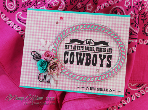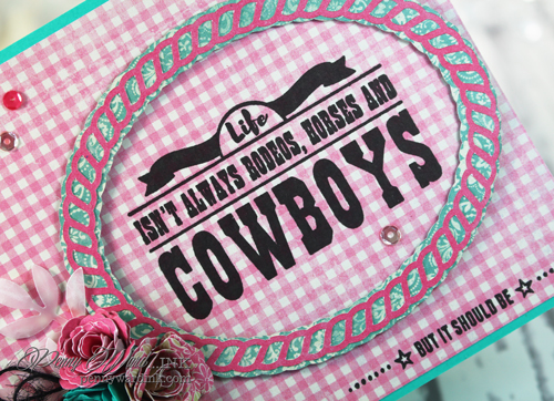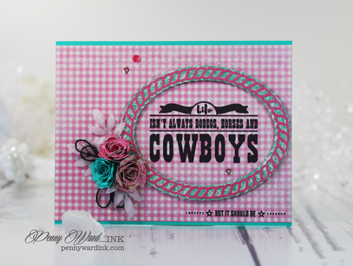 I started with a Pink gingham panel, then stamped the sentiment from the Cowgirl Up set. Oval frame is popped up with foam adhesive.