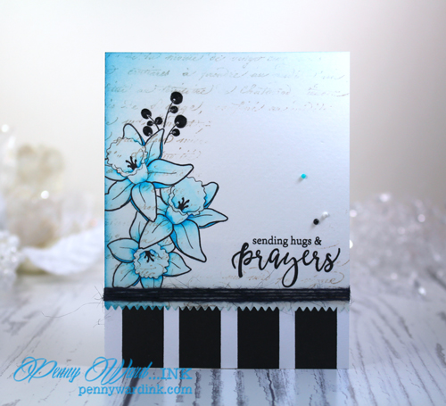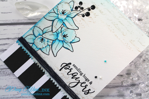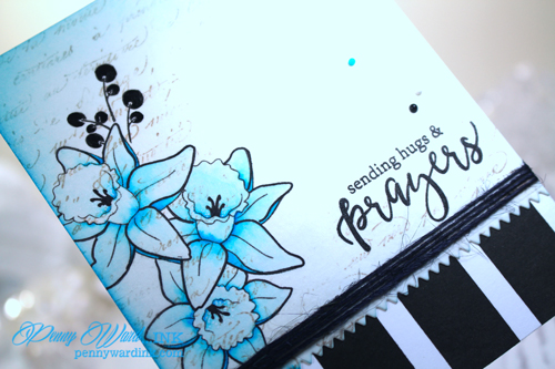 After coloring the flowers, I also stamped a little script over the left side of panel and die cut the jagged edge.