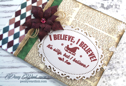 A strip of Vellum that is stamped and heat embossed with a greeting, then sewn across the top. Finally, a tiny butterfly that has been fussy cut.