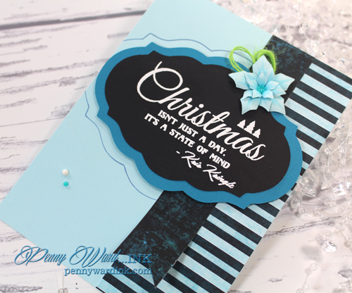 Label for the sentiment was cut two times (one small, one big). I then traced around the largest one onto the card base with a Blue Metallic Pen.