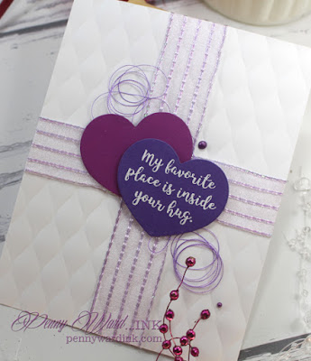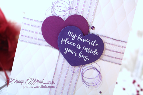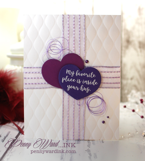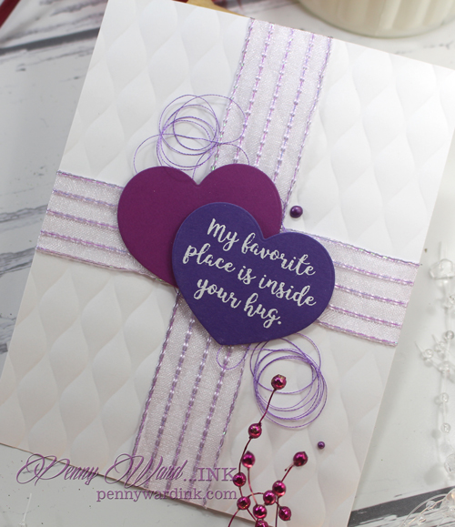 An embossed background, sheer ribbon wrapped around card front and finished with a couple of die cut hearts.