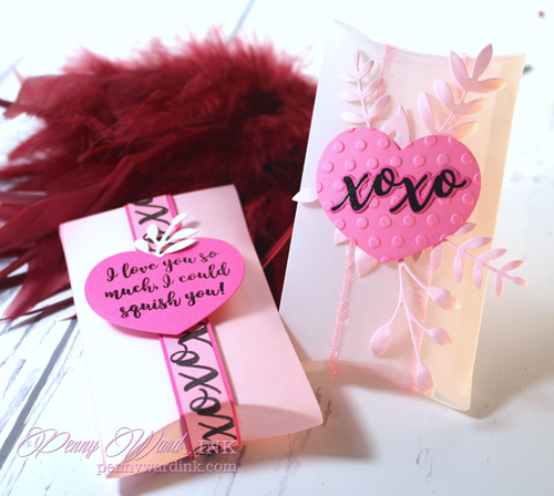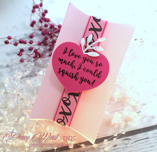 The XOXO band is a 12 inch strip of card stock that has been repeatedly stamped, then wrapped around the Pillowbox.