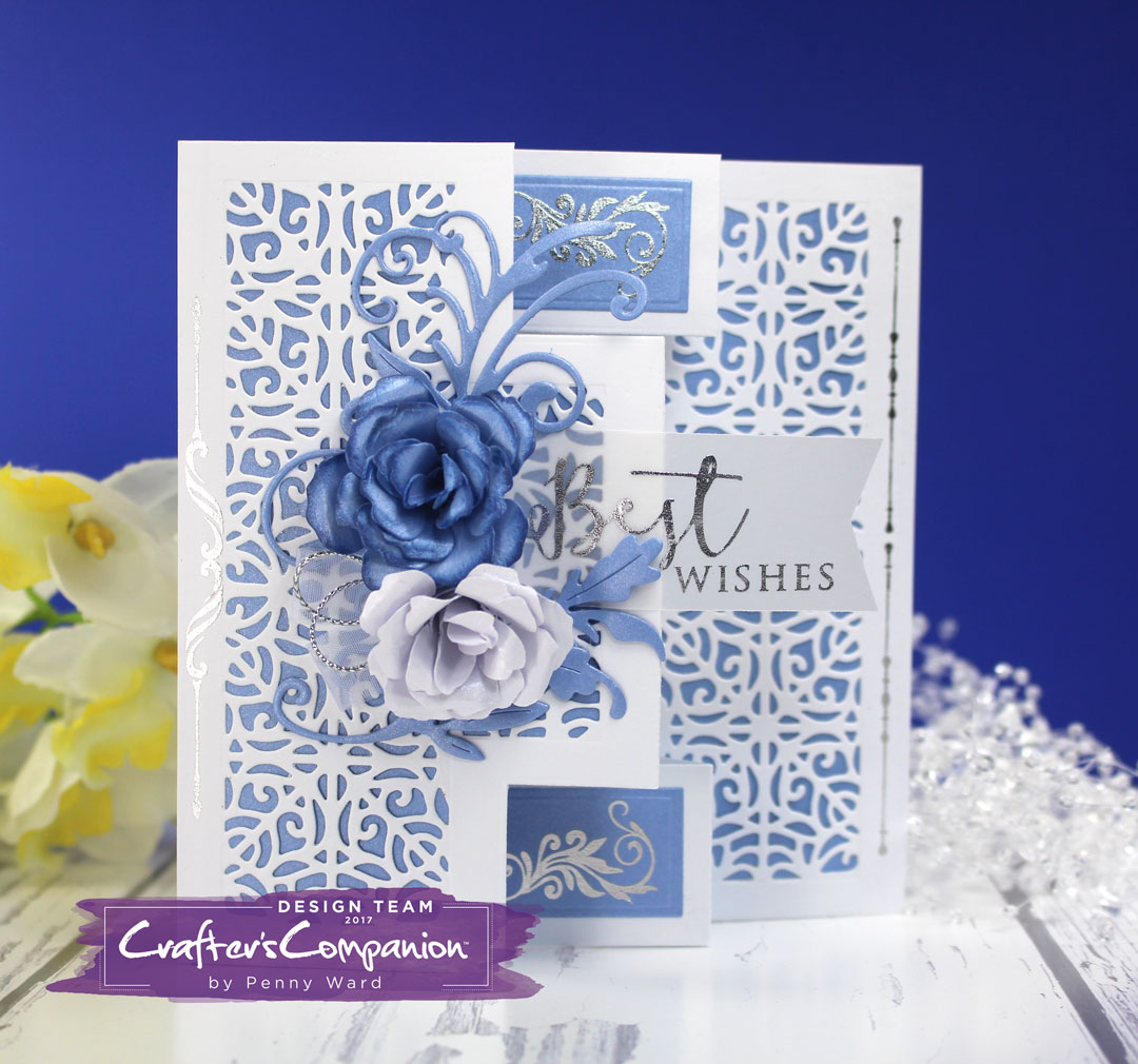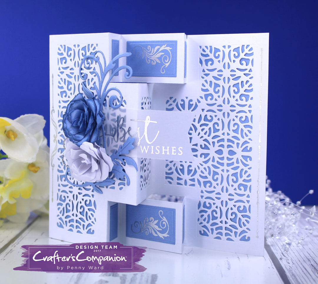 The Create-a-Card Shutter Card die comes with the main die ( to make the shutter shape) as well as the intricate dies and plain rectangle dies. There are so many die cut combinations you could apply to your own card.