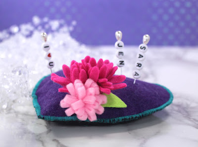 A pretty pincushion personalized with those cute beads from the Dollar Tree.