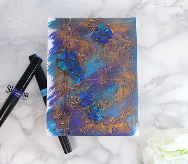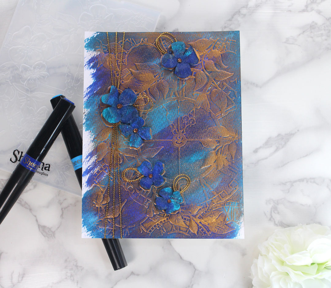 This is the Sheena Douglass Trailing Time 3D folder with some of her new Sparkle pens and a touch of Copper Gilding Wax.