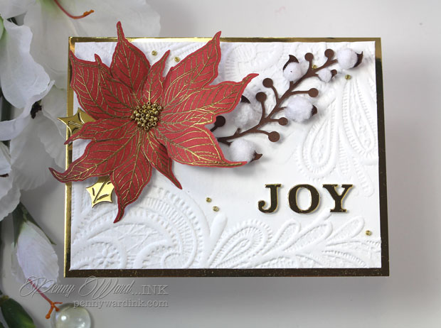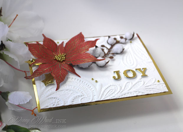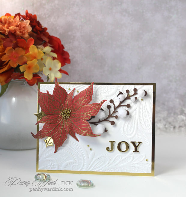 JOY was die cut from Mirrored Gold cardstock as well as a couple of Holly leaves that I tucked under the poinsettia.