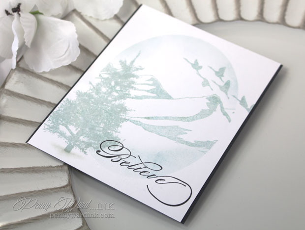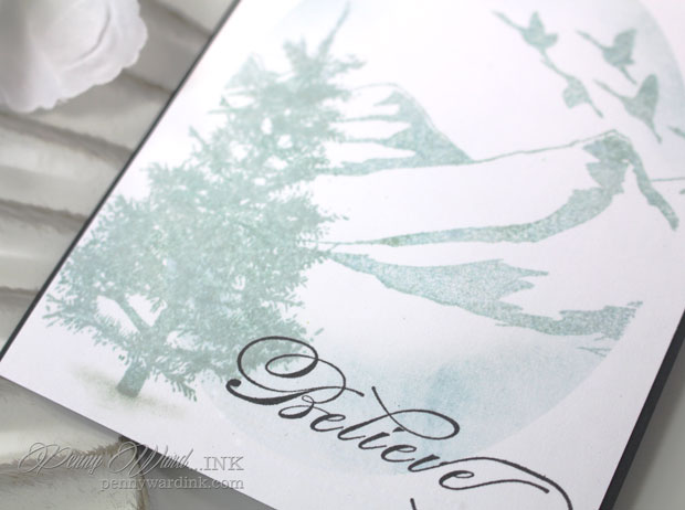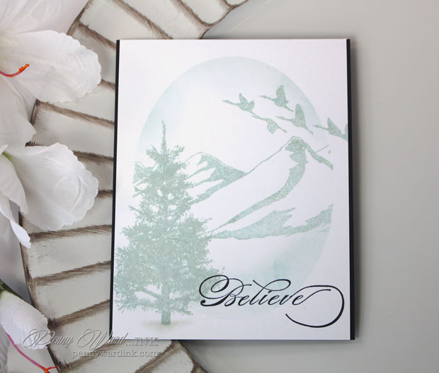 Die cut Oval to use as a mask, then using Penny Blacks Seasons Marvel stamp for the mountains, and geese. Removed mask and stamped tree.