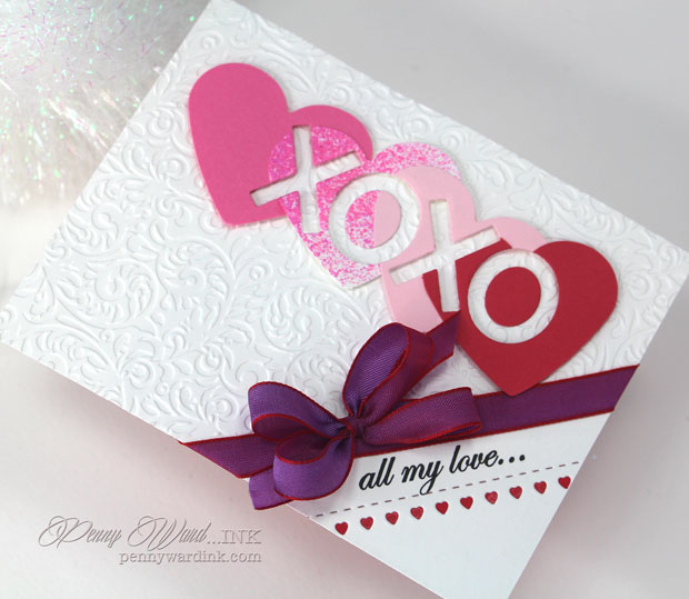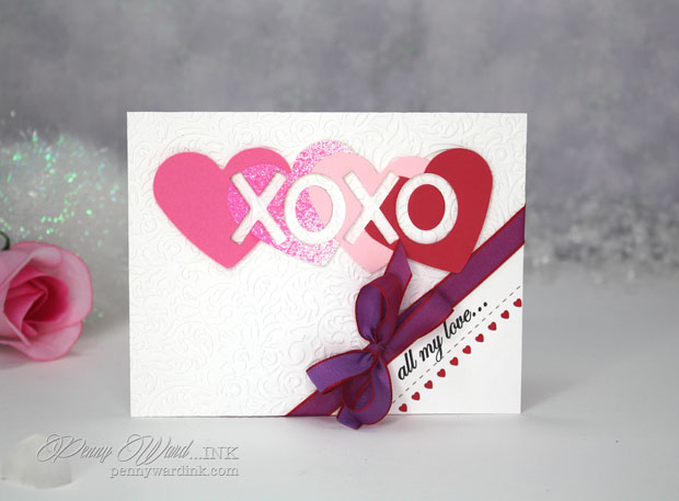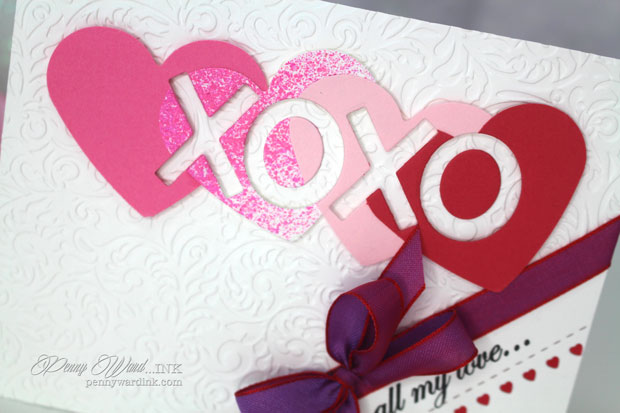 Large hearts were punched from pink cardstocks, glued together then die cut with Stitched XOXO, as was the corner.