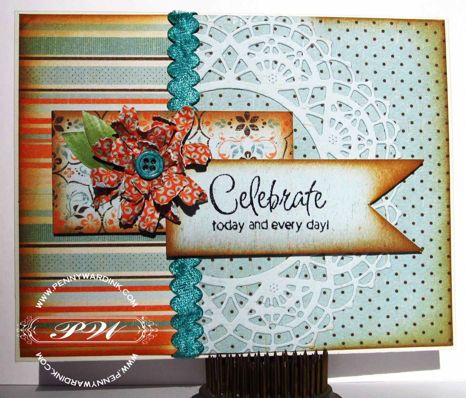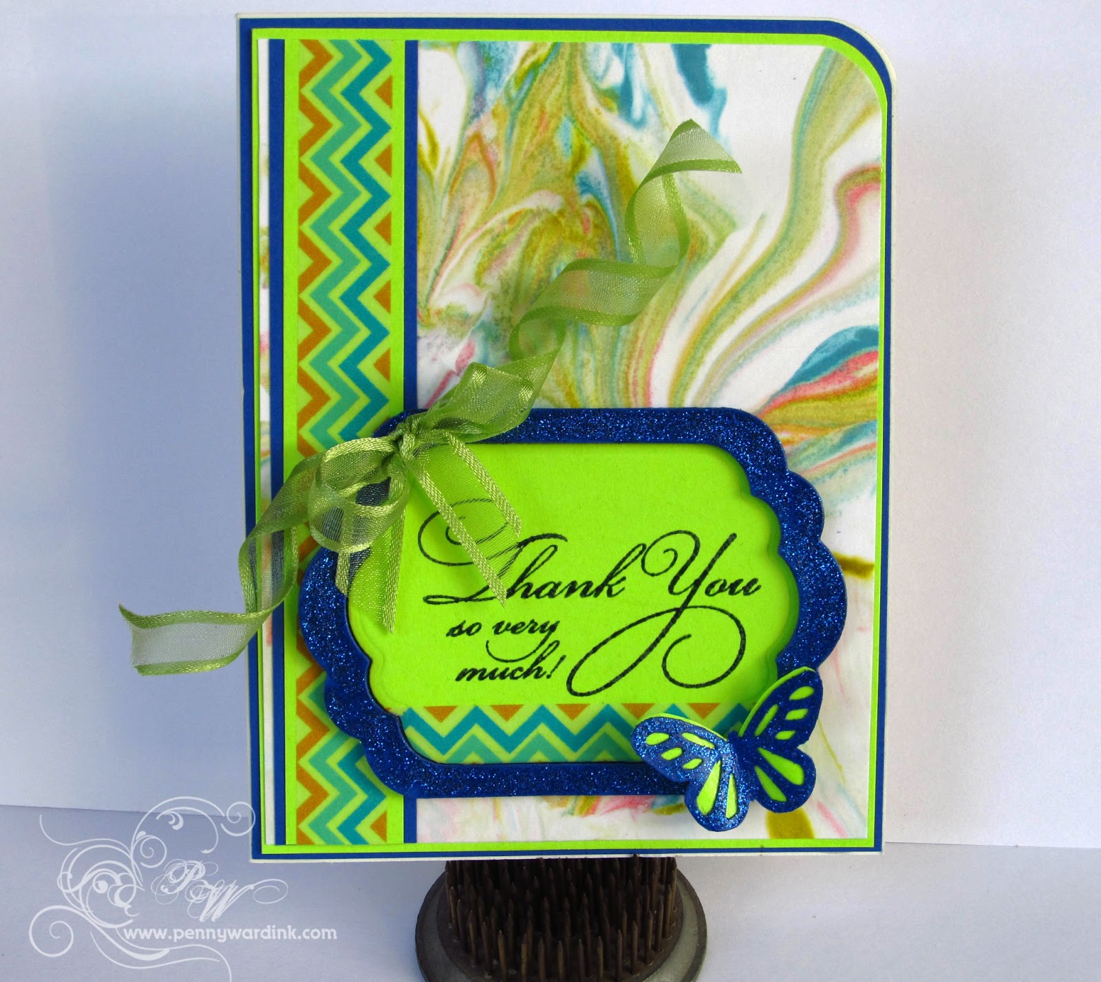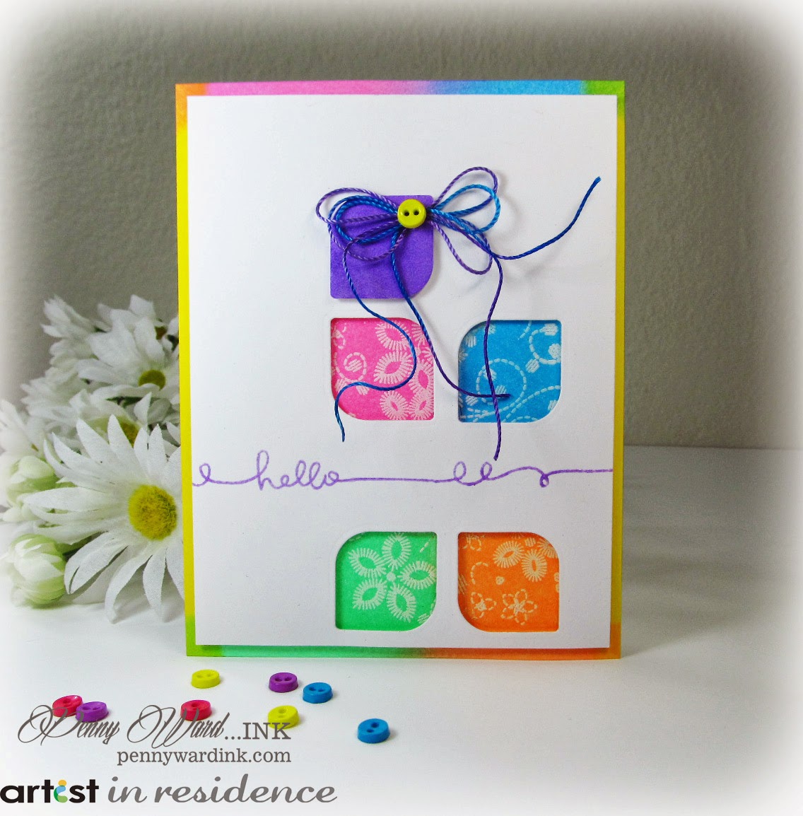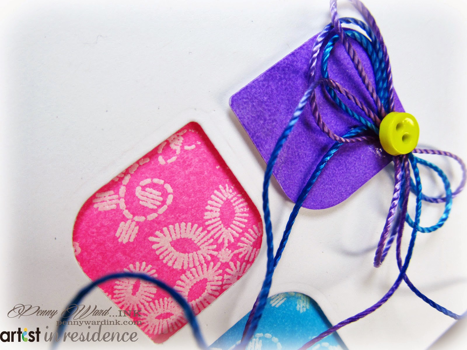 4. Die cut and ink a tag using Radiant Neon Purple. Adhere to card front with foam adhesive. Tie floss into a double bow, attach and add a neon button.