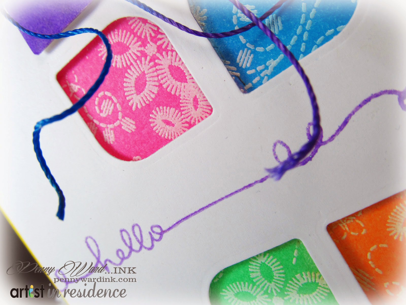 3. Take a large scrap of white card stock, stamp and heat emboss tiny flowers. Ink around the flowers with four of the Radiant Neon inks. Adhere to back of die cut panel with foam adhesive so the pretty neons show through the openings. Adhere this panel to card base.