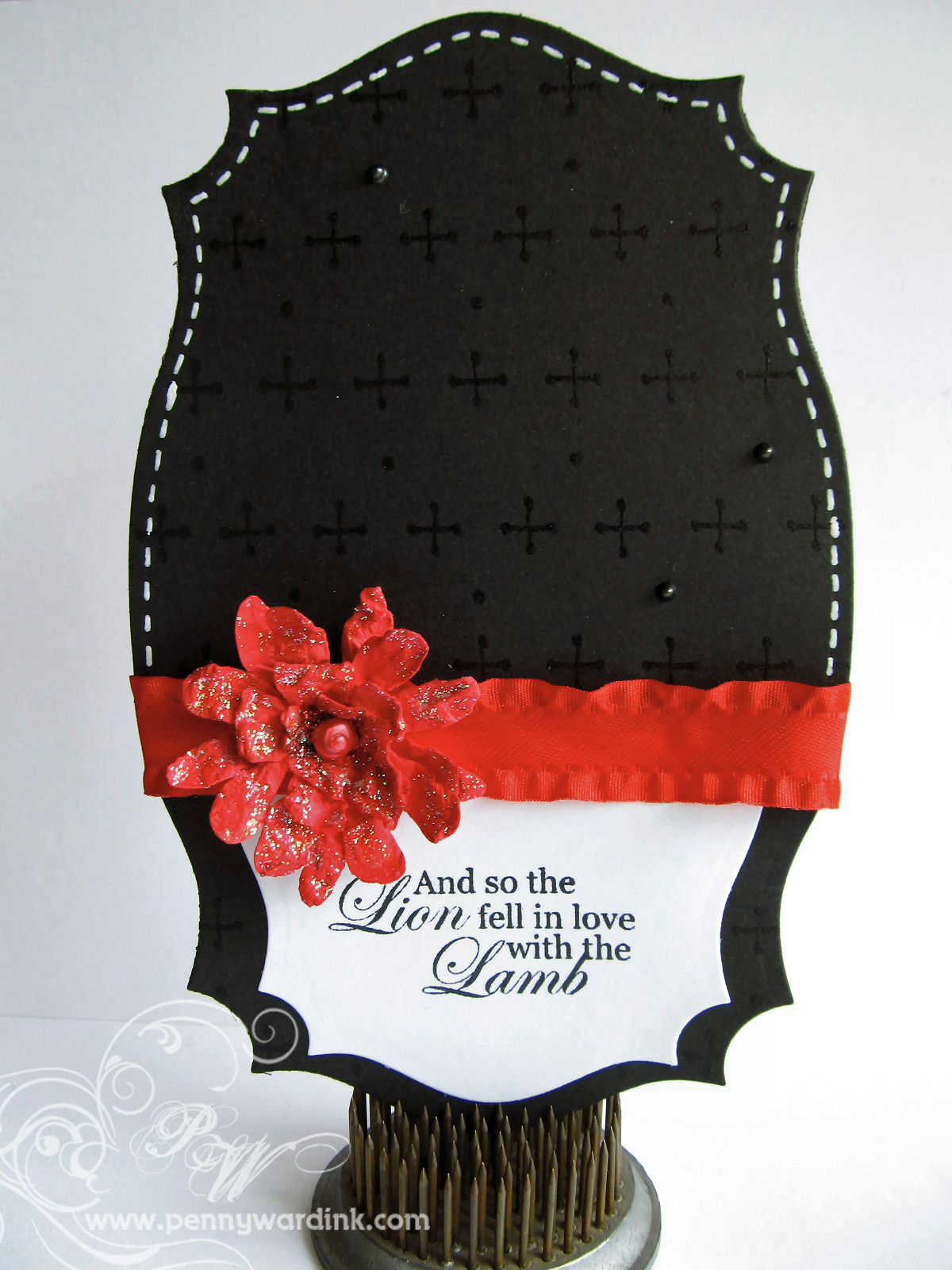 2. Cut white card stock just a bit smaller than base. Die cut openings as shown using Tiny Tags die. Stamp and heat emboss sentiment.
